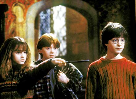 Chris Colombus dirige seu jovem elenco em A Pedra Filosofal. Ele foi elogiado por sua paciência com as crianças nas Filmagens.